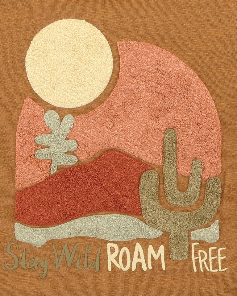 For little adventurers who love to roam, this graphic tee brings the desert to life with bold textures and earthy tones. Featuring a layered embroidered scene of cactus, sun and sand, it's a tee made for exploring - whether it's the backyard or beyond. Comfy, playful and full of character, it's perfect for pairing with our gingerbread shorts for a sun-drenched summer look.