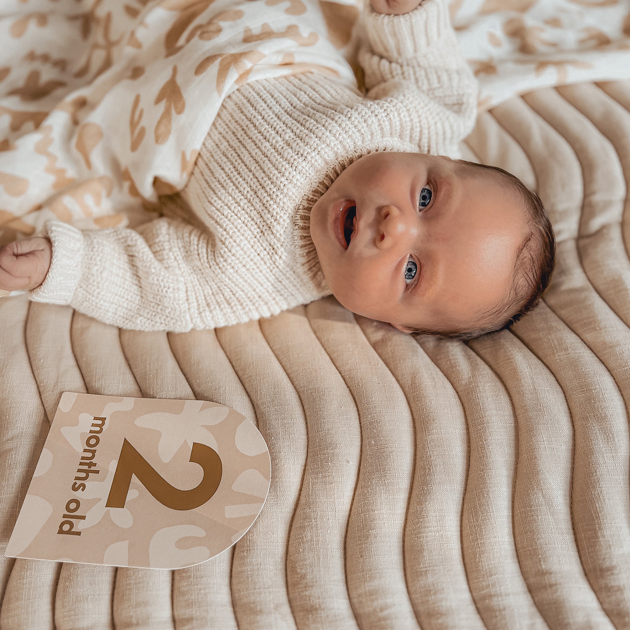 Includes 34 cards with rounded corners safe for little hands, a special card for your birth announcement, plus all the important milestones from one day old to one year old. All in pastel and neutral colours with gold foil on every card.