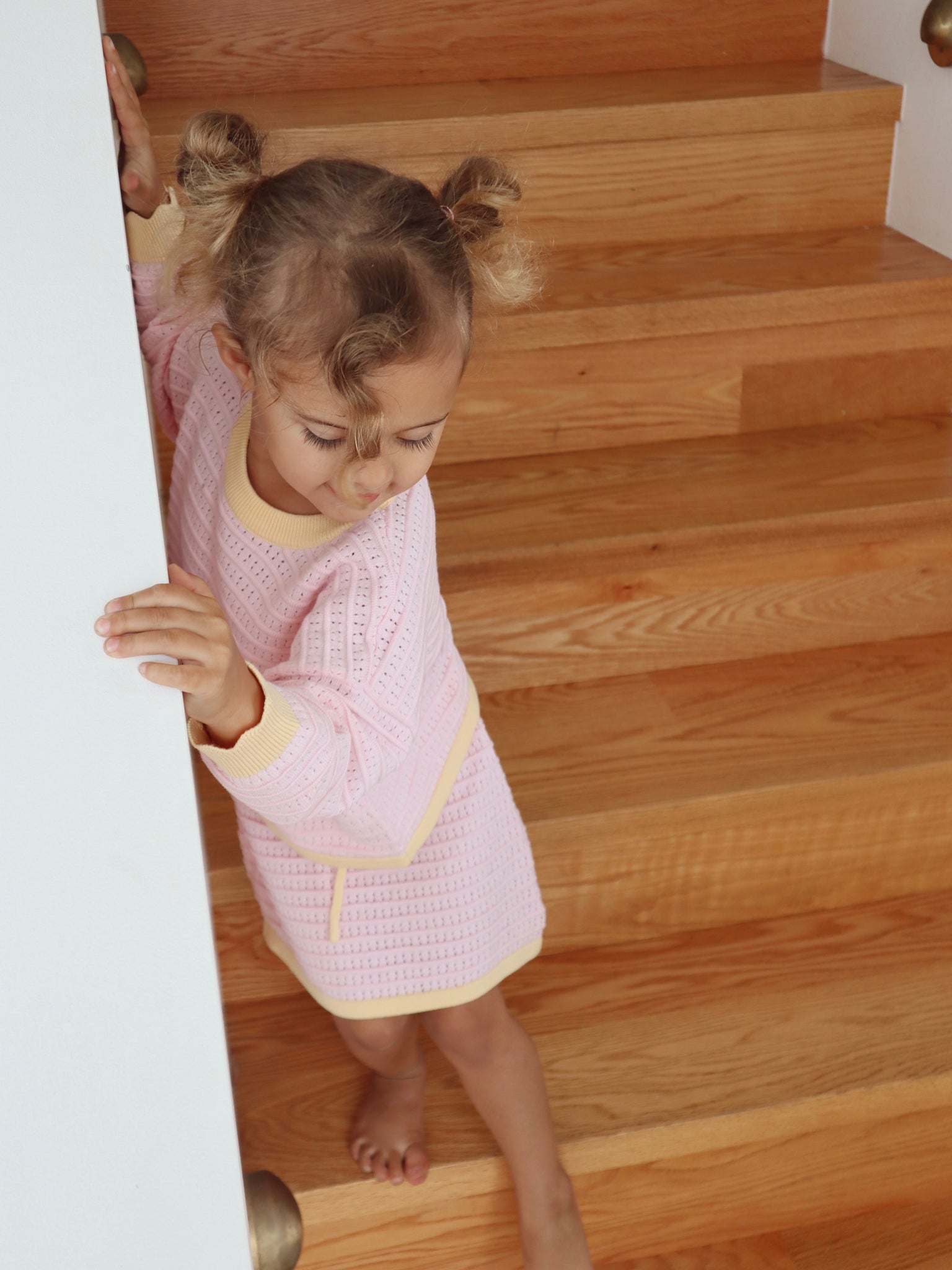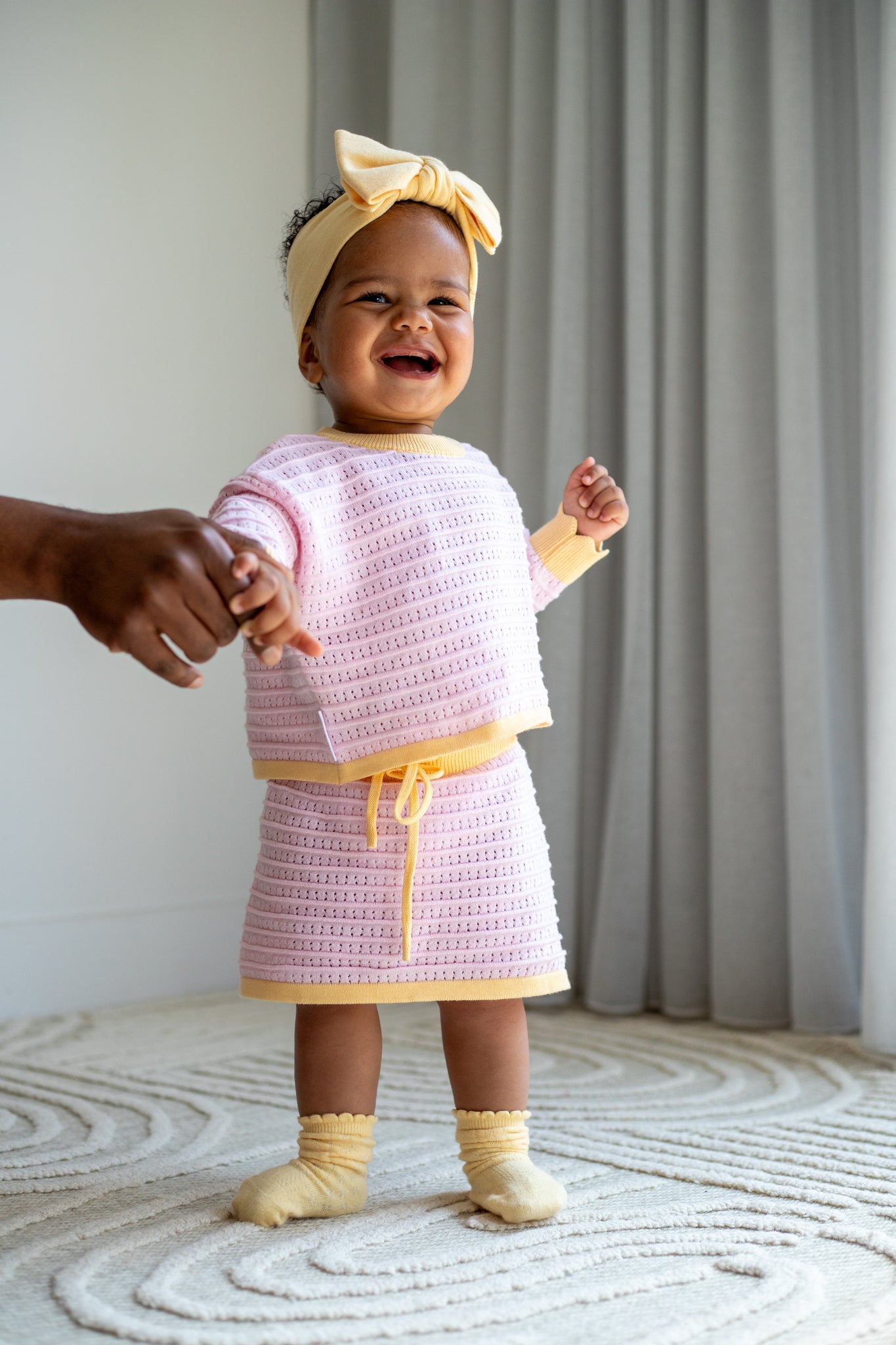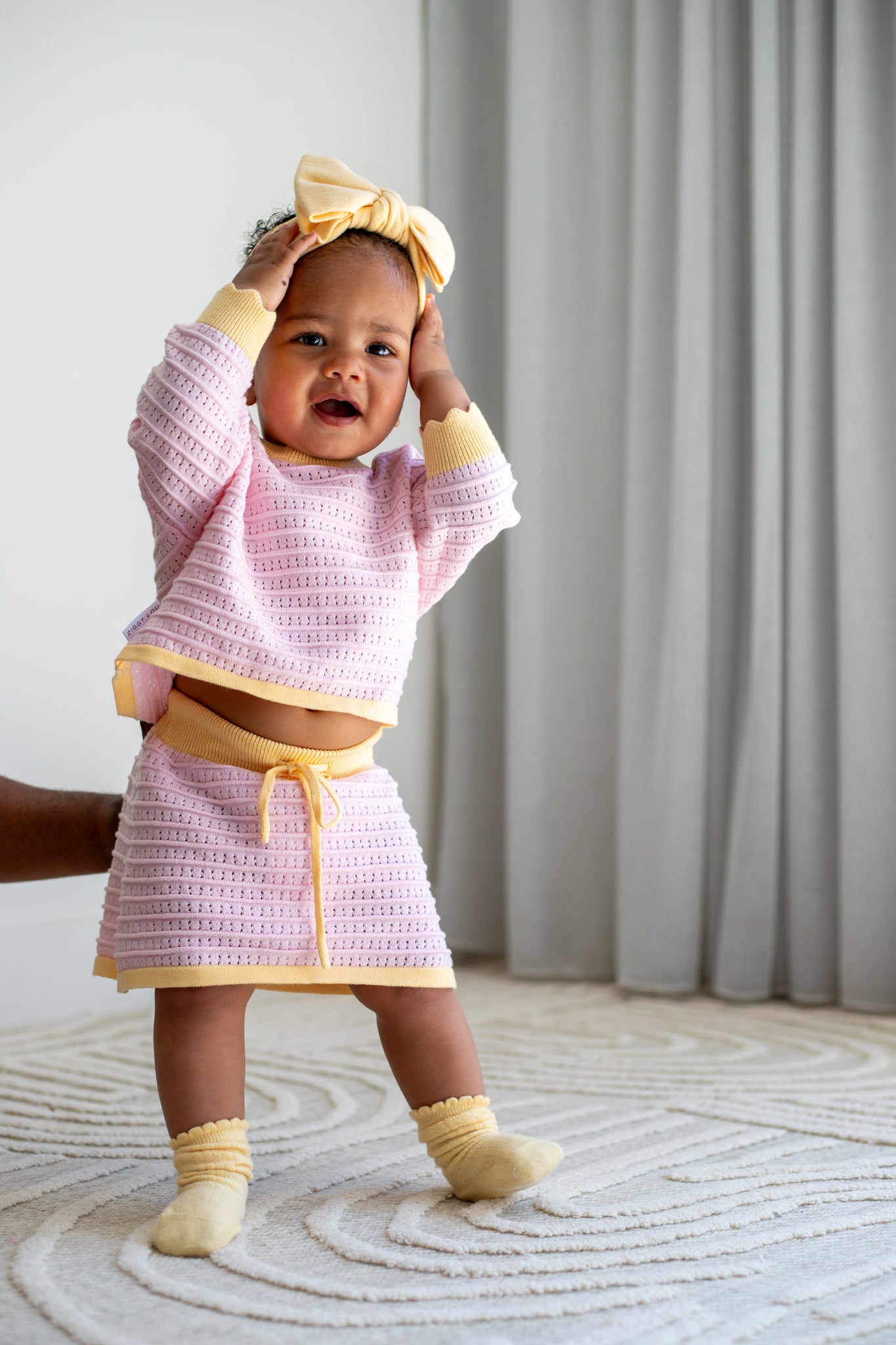 Cropped eyelet knit jumper with scalloped cuffs featuring our Freya + Butter colours. Mix and match with items from our August, Freya + Clementine Summer Collections.