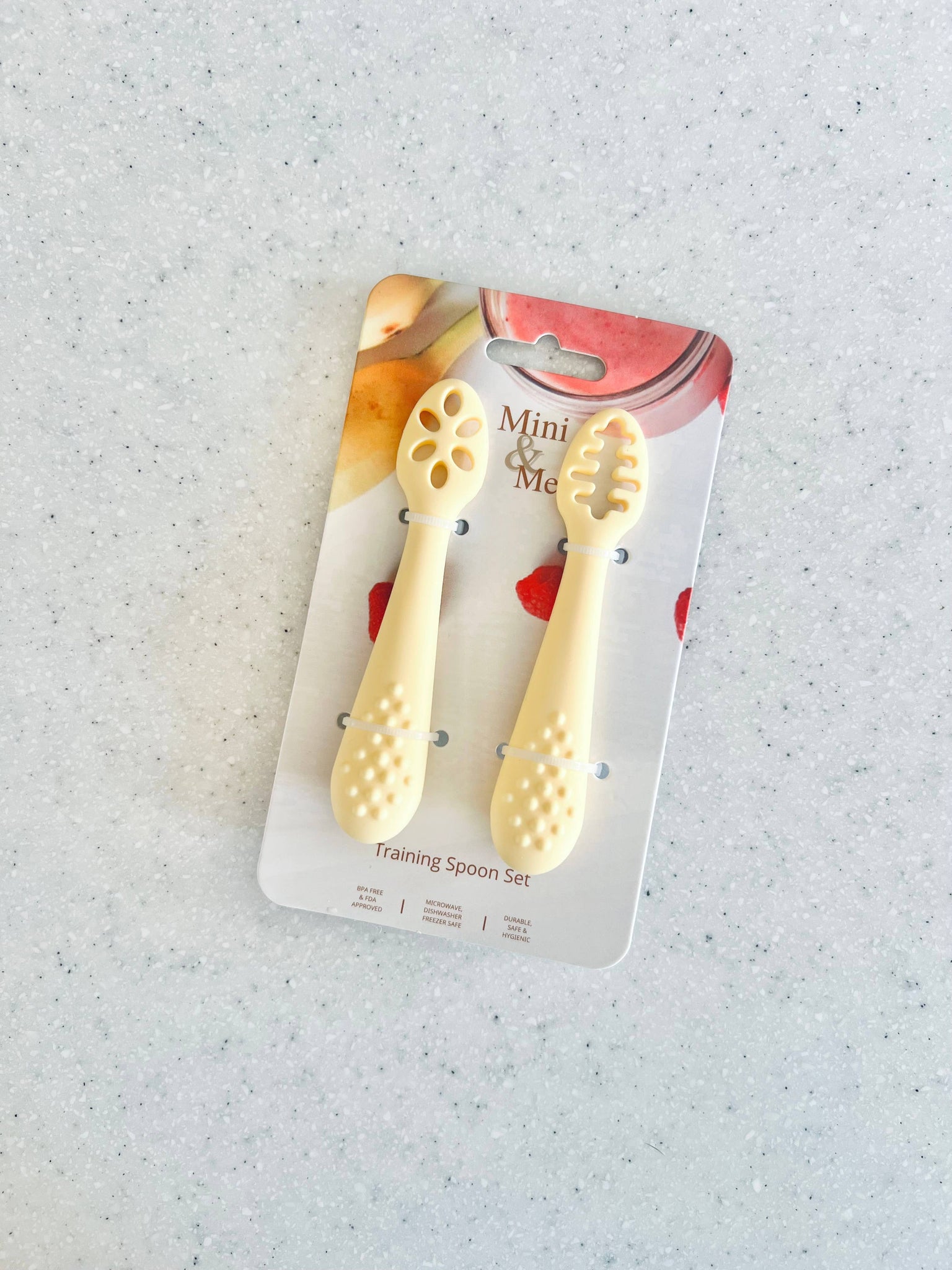 The Mini & Me Training Spoon Set allows your mini to dip or smoosh the spoon into their food. It will grip the food allowing your mini to learn how to self-feed. Lightweight, easy grip and the anyway up design make it easy to grip and control. Made from 100% High Food Grade Silicone which is BPA & Phthalates Free, Non-toxic and FDA approved. Mini & Me Training Spoon Set Features - Dippy & Smoosh Spoon Lightweight, easy grip, anyway up design BPA Free, FDA Approved Silicone Microwave, Freezer & Dishwasher safe (top row) Durable, Safe & Hygienic Suitable from 4 months+ Size 11cm Care - Microwave & Dishwasher safe up to 220 degress. Made in China. *images for illustration purposes only, colours may vary on your screen.