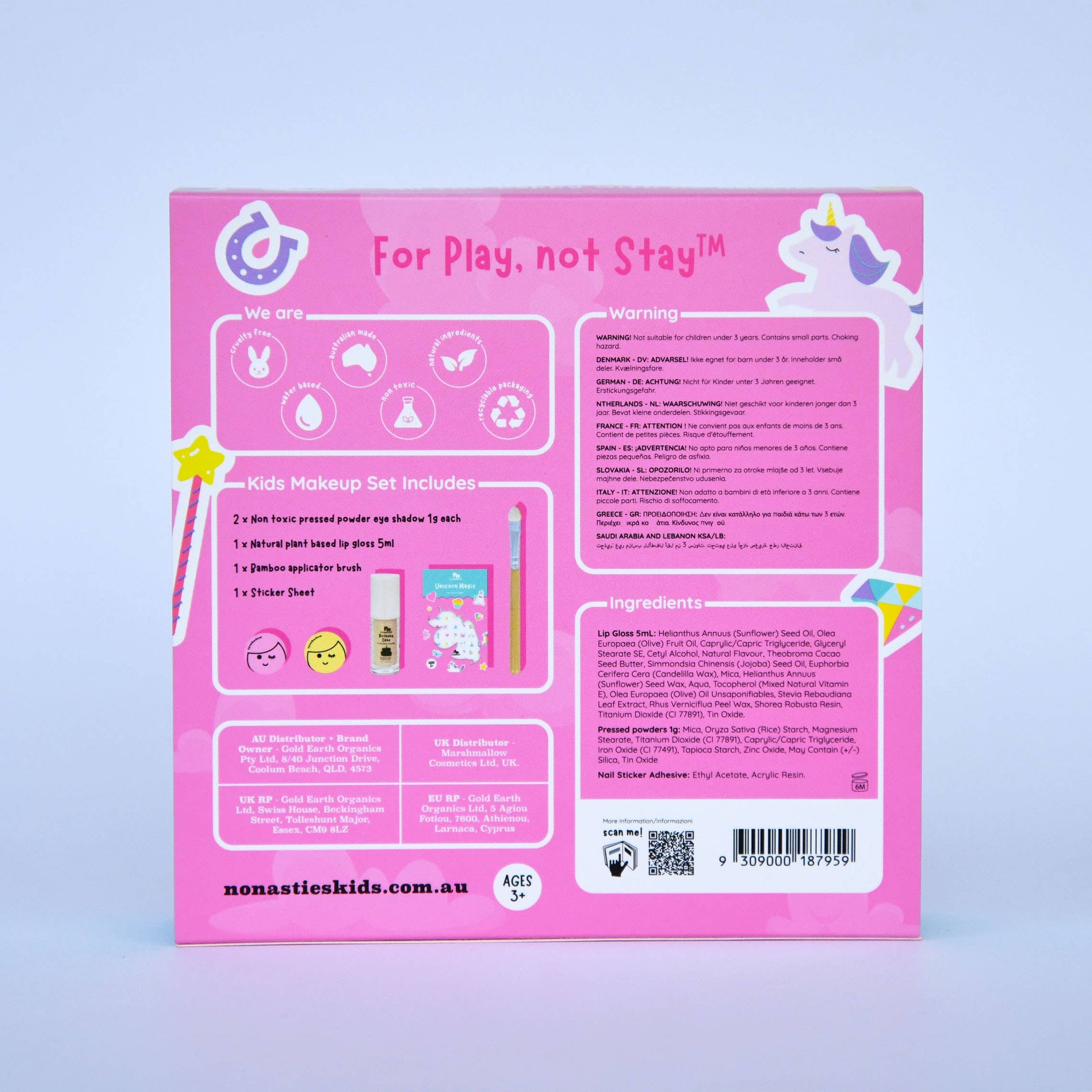 Unicorn Magic Kids Makeup Set – Natural & Non-Toxic Pretend Play Makeup by No Nasties Kids Let their imagination gallop into a world of glitter free magic with the Unicorn Magic Kids Makeup Set! Bursting with colour, creativity, and unicorn themed fun, this all natural kids makeup set is specially designed for safe, sensory-friendly play for children aged 3 and up. Proudly Made in Australia, each product is created with clean, non-toxic ingredients and eco-conscious packaging, because magical moments should be safe for little skin and the planet. Set Includes: 💗 Pink Natural Pressed Powder – in a cute, recyclable eco container ⭐ Limited Yellow Natural Pressed Powder - Hypoallergenic for precious skin 🎂 Birthday Cake Lip Gloss - a sweet, scented, glossy treat for lips 🦄 Unicorn Magic Nail Stickers - peel-and-stick nail art fun for tiny fingers 🖌️ Bamboo Applicator Brush - soft-latex free sponge and perfectly sized for little hands Why You'll Love It: ✅ Non-toxic formula & Natural Ingredients ✅ A