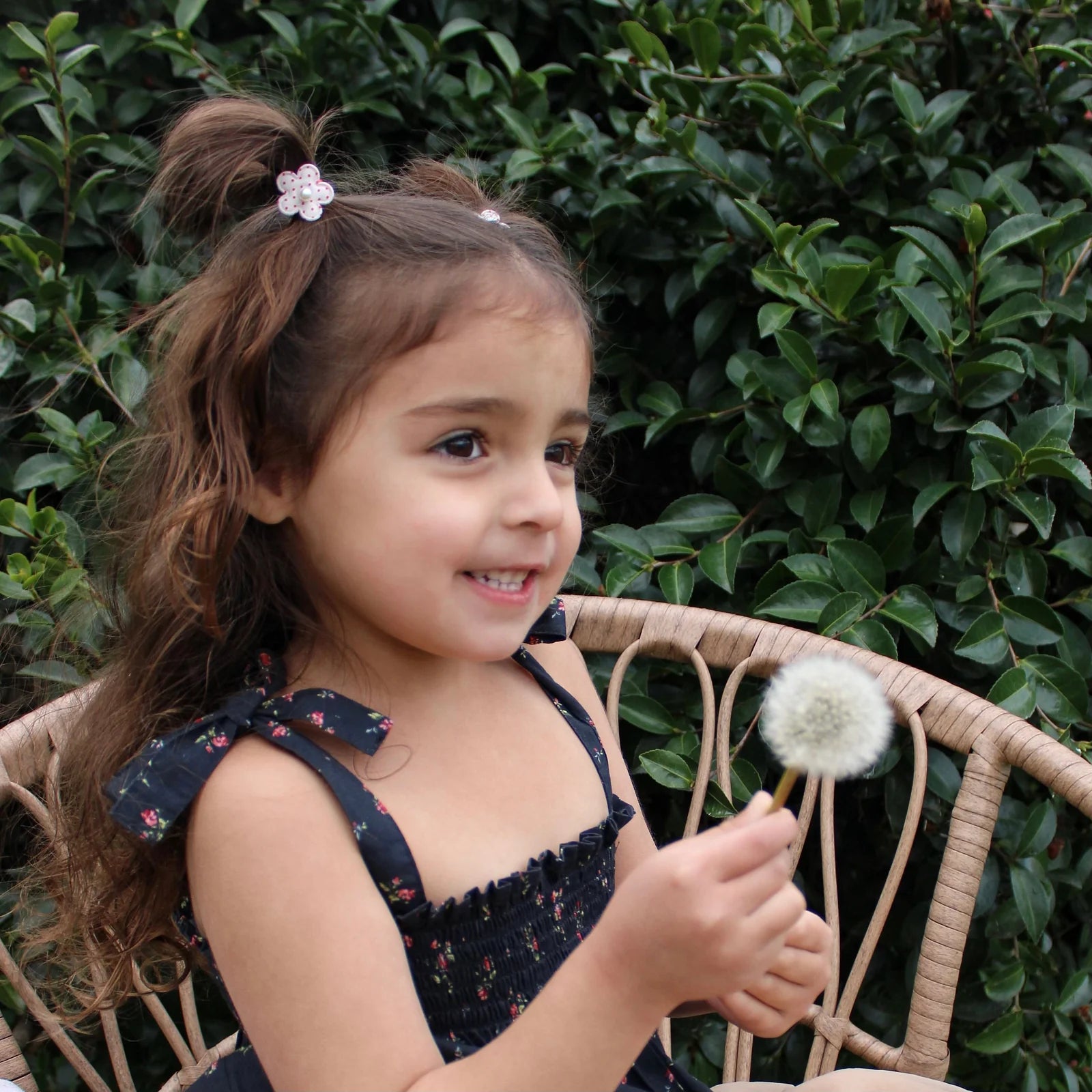 This set includes 2 cotton flower hair ties, each featuring a sweet pearl centre. The flowers measure approximately 2.2cm, and are attached to soft, stretchy elastics with a 3cm diameter for a comfortable fit. The backs of the flowers are covered with felt for extra security and durability.
