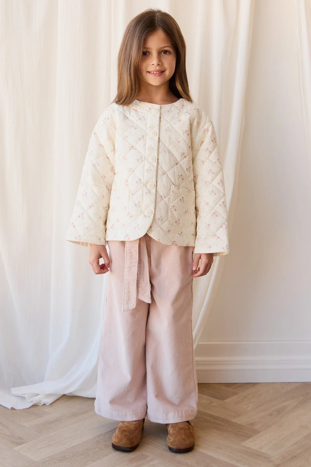 The Adalyn Pant - Morganite is a beautifully tailored wide-leg cord pant, designed to bring comfort and elegance to your little one’s everyday wardrobe. Crafted from a premium blend of 98% cotton and 2% elastane, this piece offers just the right amount of stretch for playful movement while maintaining a structured silhouette.