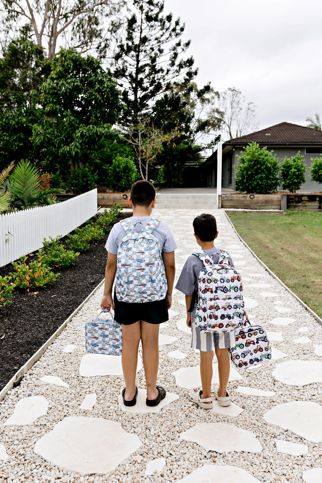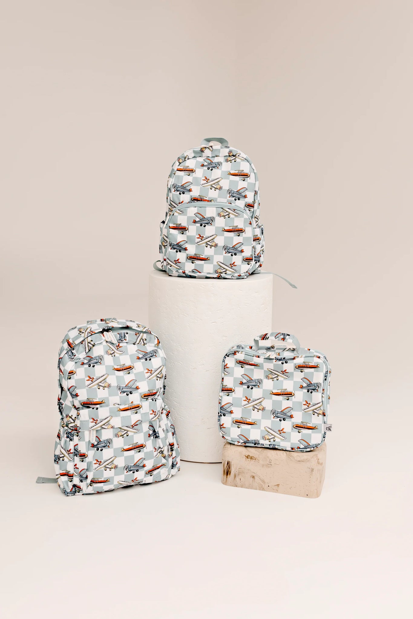 Take lunch to new heights with our Cloud Cruiser insulated lunch bag – the perfect companion for little pilots on the go! Featuring bold vintage airplanes on a soft blue check background, this bag keeps food cool and adventures even cooler.