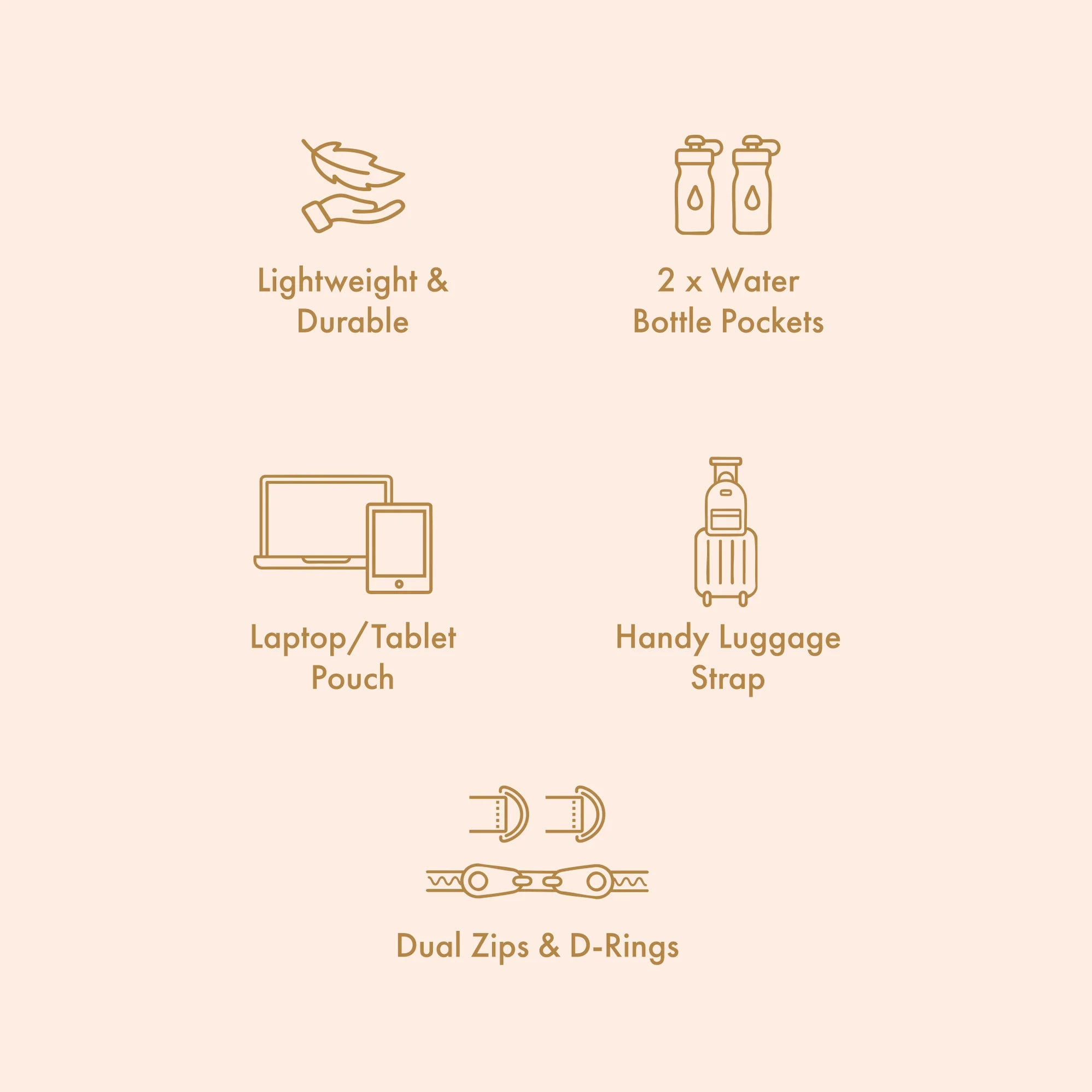 We’ve got dual pockets (one on each side) for water bottles, bucket hats, even toys or shoes and there’s two bonus zips inside as well as a generous outer pocket with a super cute scalloped rubber zipper pull.