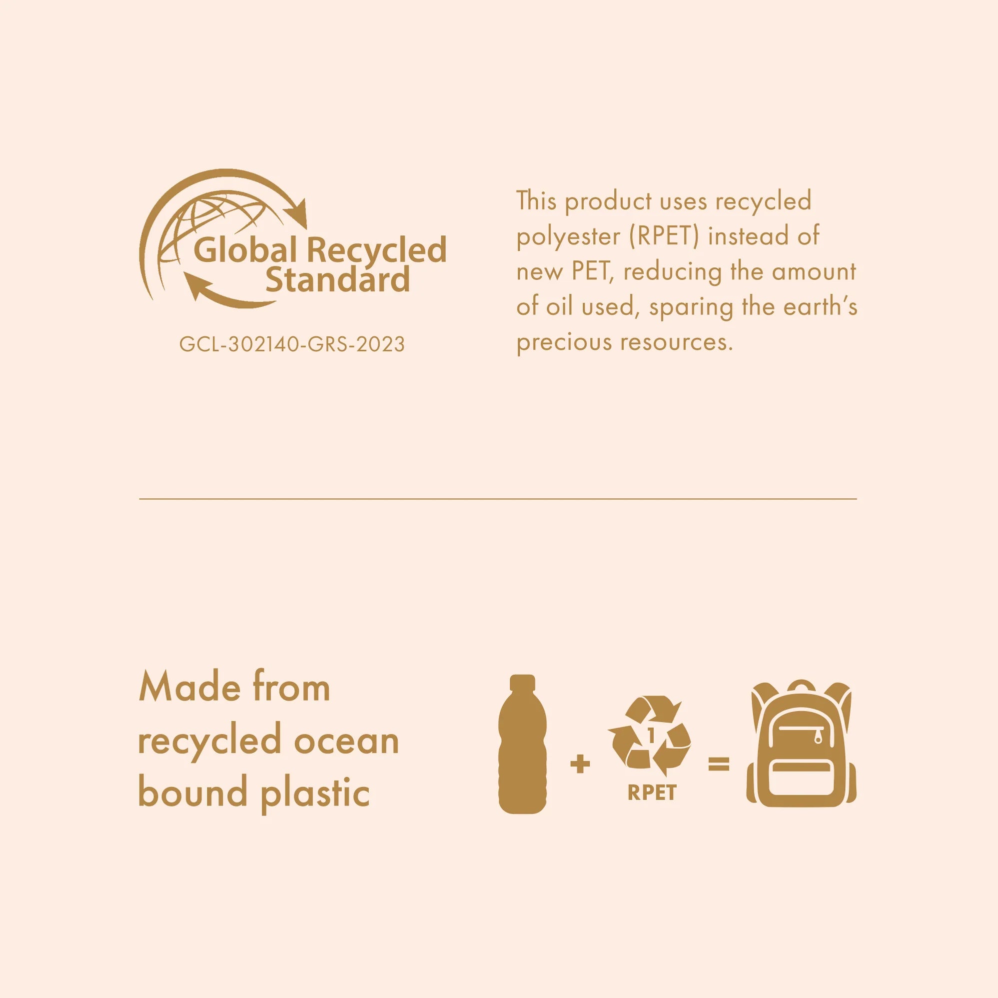 This product uses recycled polyester (RPET) instead of new PET, reducing the amount of oil used, sparing the earth’s precious resources. Scope Certificate Number: GCL-302140-GRS-2023.