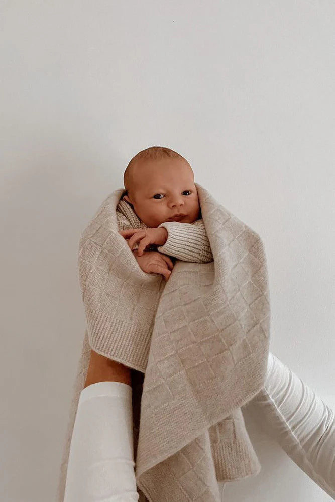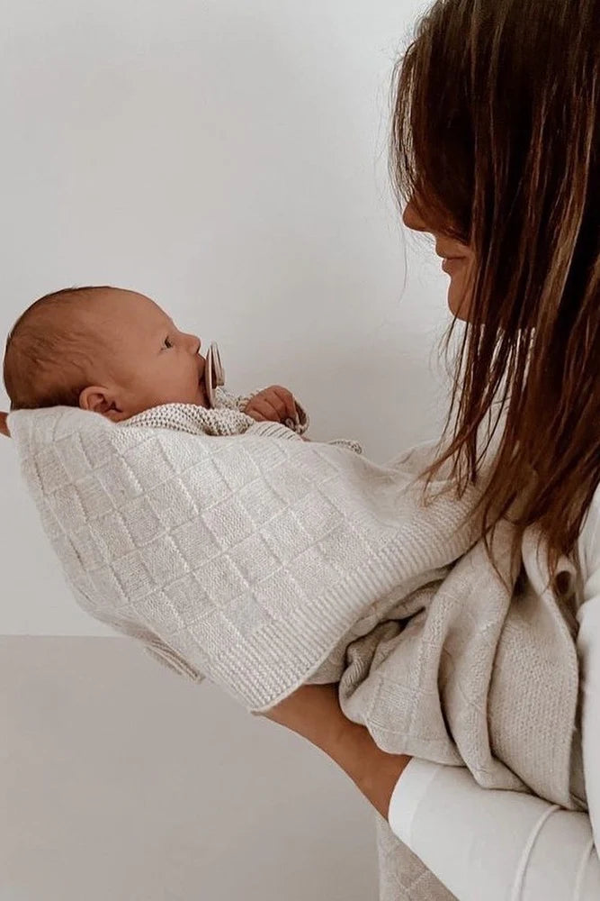 Australian Merino Wool provides unique moisture wicking, temperature regulating and odour resistant qualities, superior to standard wool varieties. These magical, breathable fibres are significantly finer than standard wool, giving Merino wool a super soft, non-itchy feel. Featuring a checkerboard knitted design, ribbed edging and elegant oatmeal colour, this blanket is not only beautiful but sure to have your little one snug as a bug in a rug!