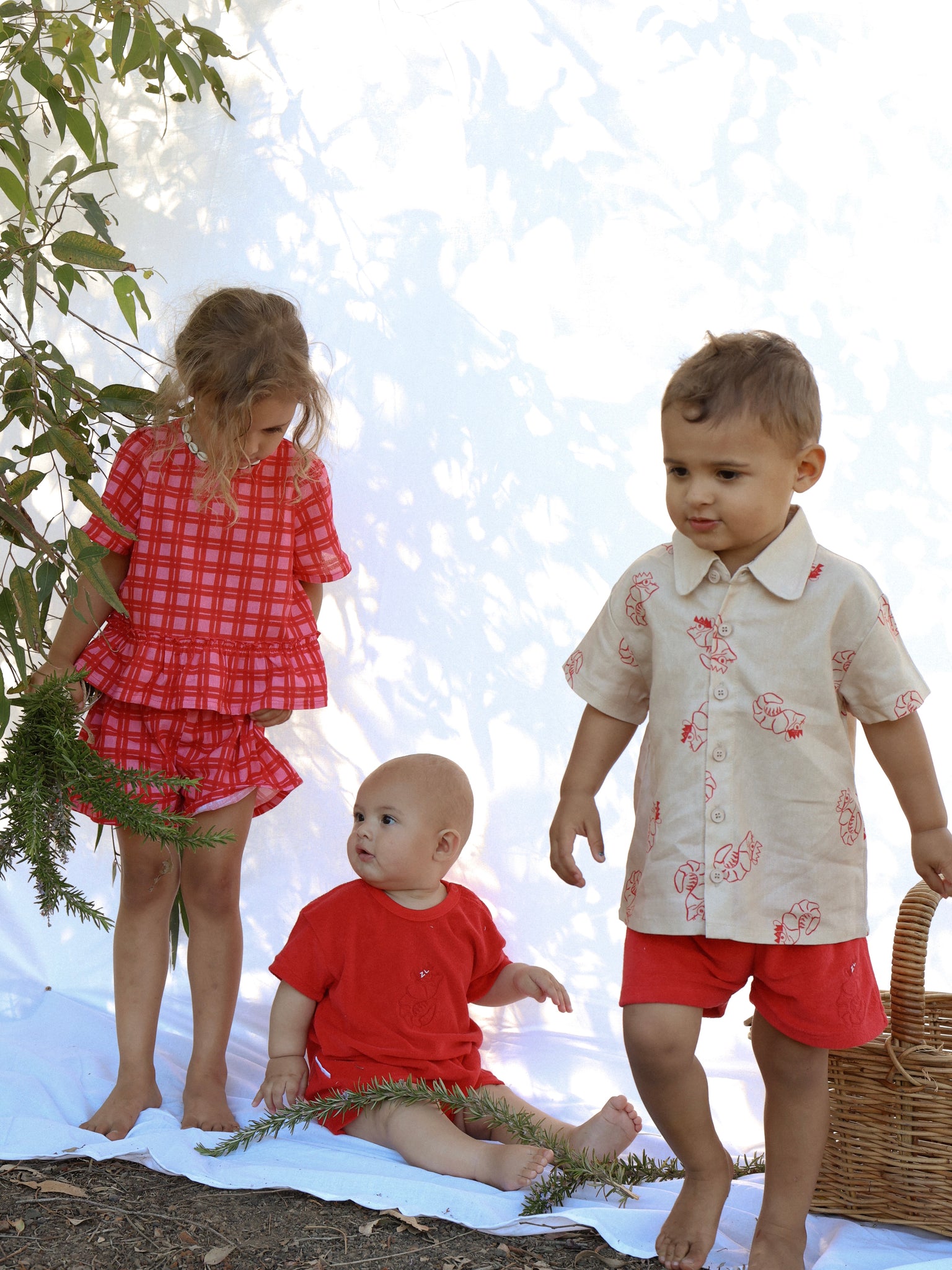 Cotton short sleeve top featuring our exclusive Jolie print. Functional button on the back of the neck for easy on/off, ruffle frill hem detail at waist. Mix and match with items from our Christmas Collection.