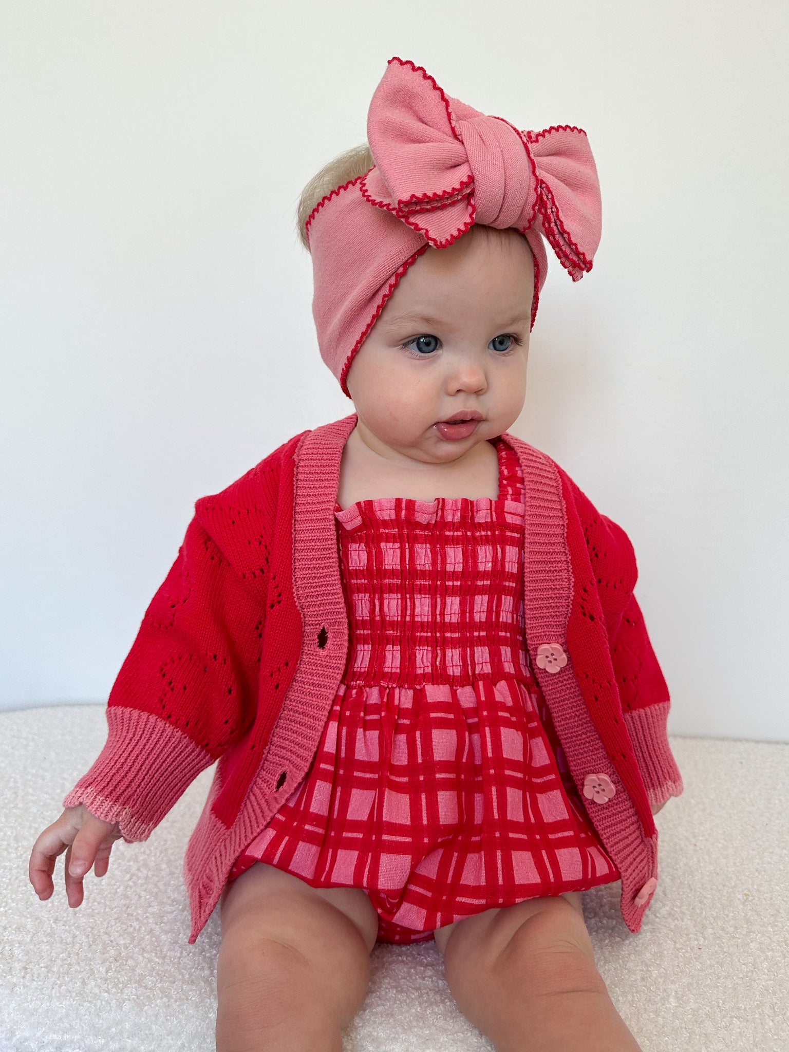 Thin knit cardigan in our Scarlet colour featuring a flower pointelle detail, contrasting scallop cuffs and waistband and flower buttons down the centre. Mix and match with items from our Christmas Collection.