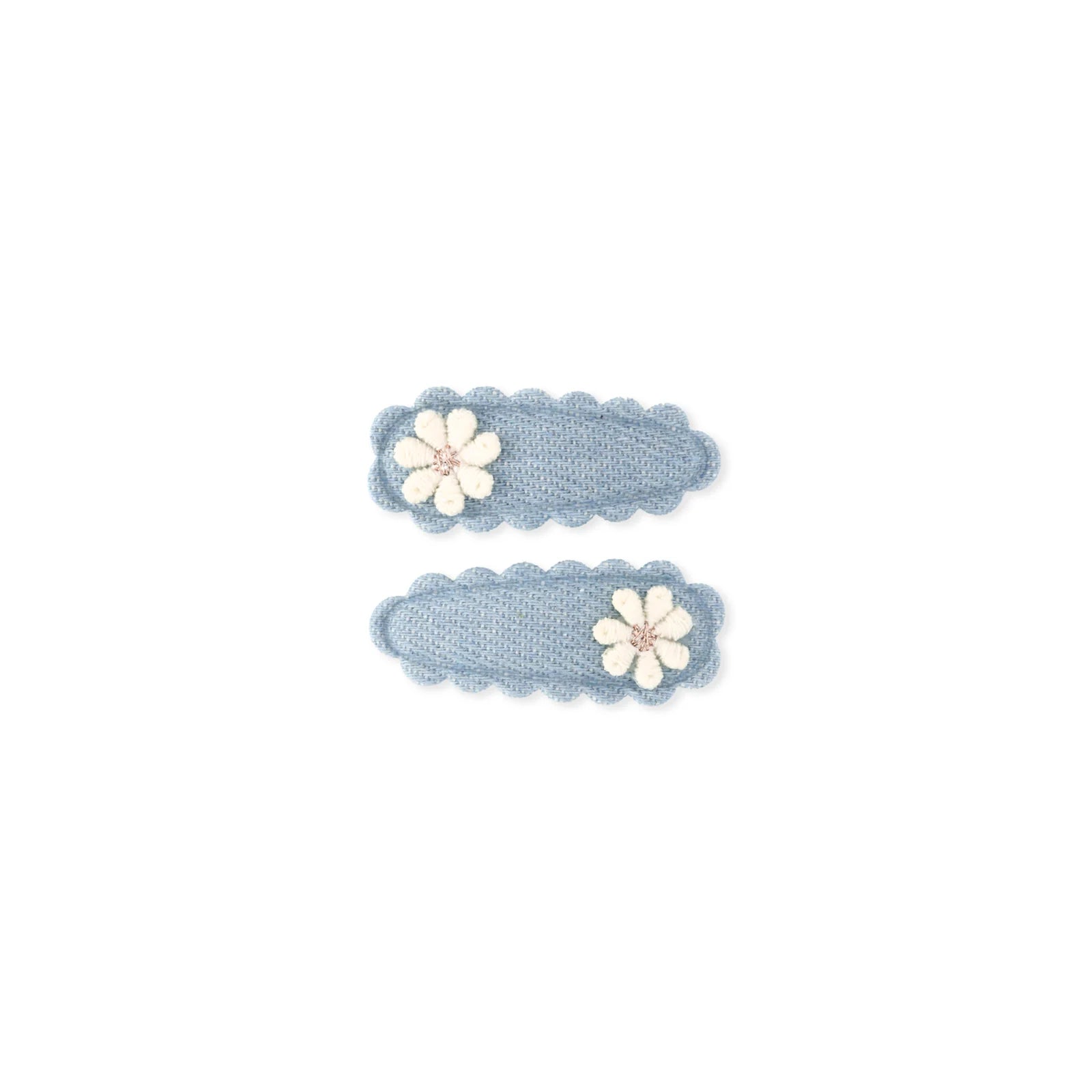 This set includes 2 snap clips, each covered with denim fabric featuring a scalloped edge design and a daisy floral lace detail. The clips measure approximately 4.6cm wide by 1.8cm tall, and the backs are finished with felt lining to help keep them securely in place.