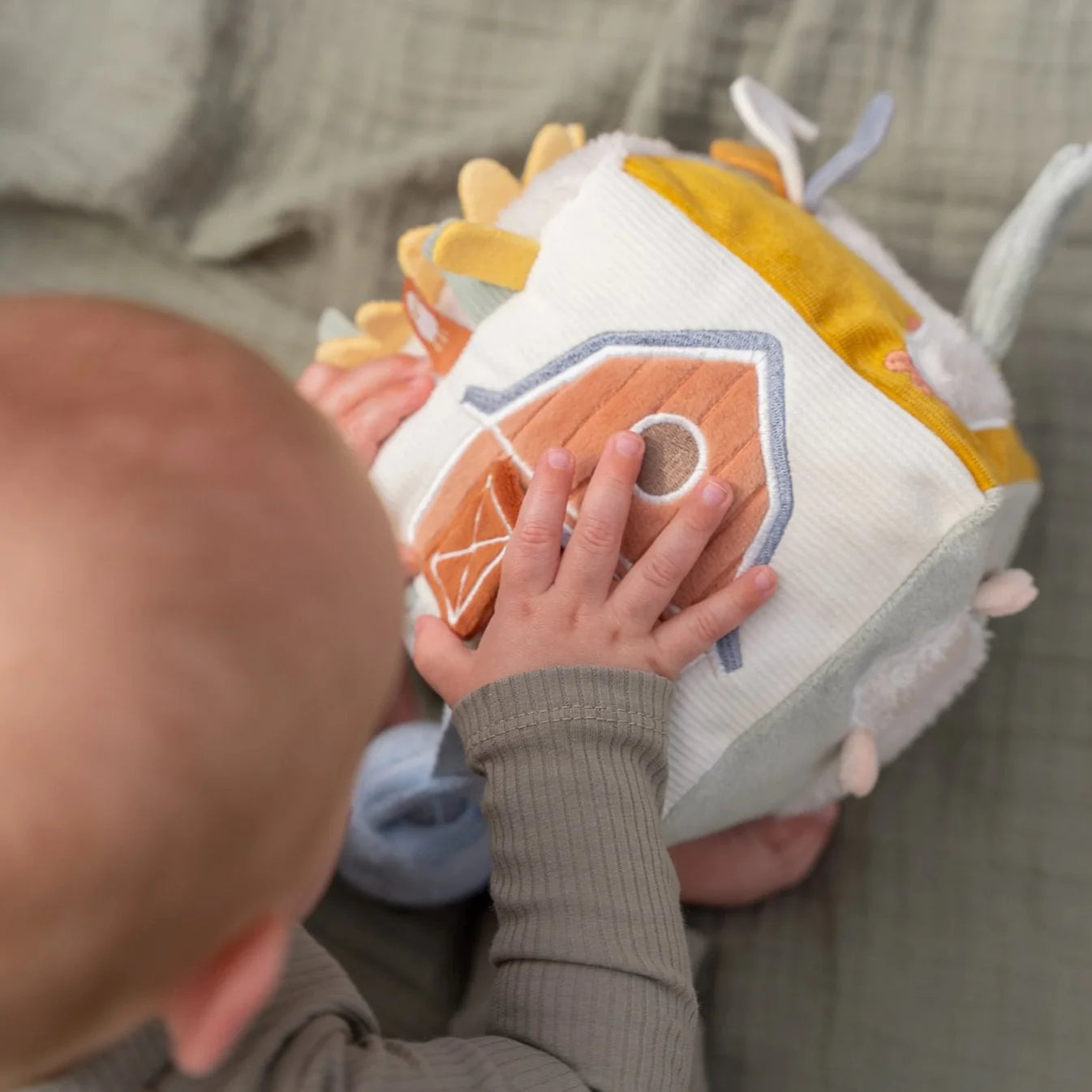 Exploring on the farm. This super soft activity cube in soft tones will surely arouse the curiosity of your little one. Each side is equipped with a different activity with different textures and shapes that help develop the senses and, of course, provide endless entertainment. The cube can be gripped and twisted and has a mirror for self-discovery.