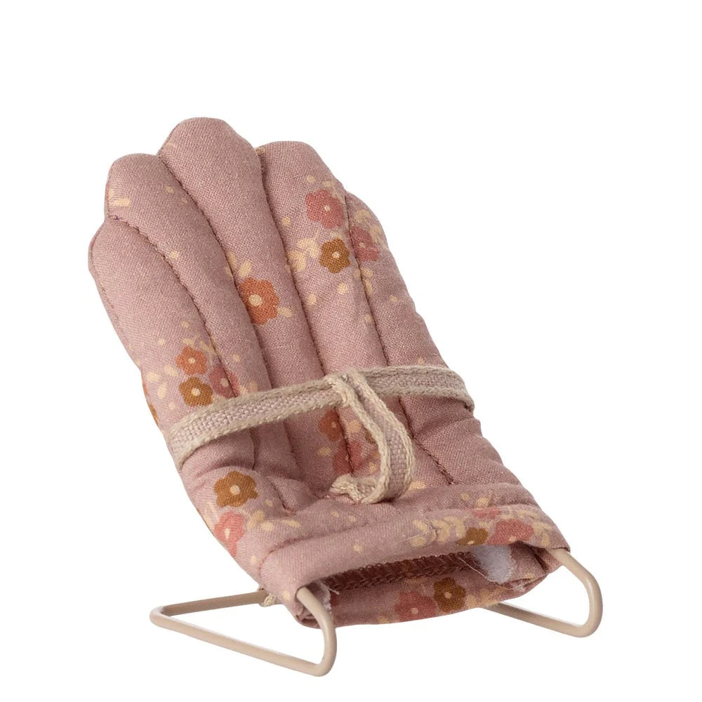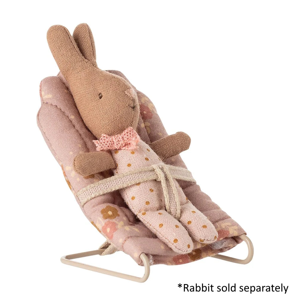 With this babysitter, it is easy to put your little Maileg friends to sleep. The base is made of metal and covered in soft fabric. The chair fits my sized rabbits and baby mice perfectly.