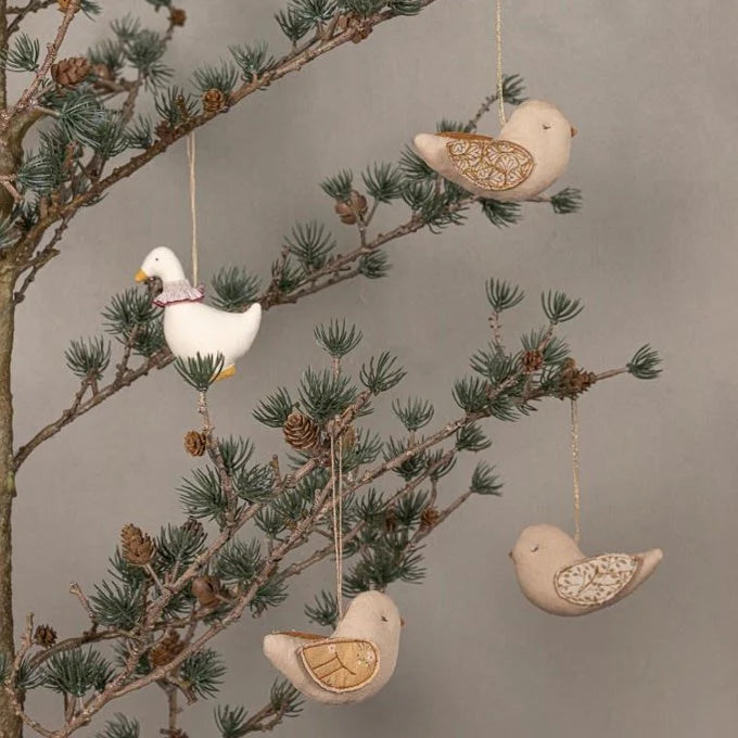 Delight in the gentle charm of the Maileg Bird Ornament Winter Heart Sand. Crafted in a soft neutral sand tone, this elegant fabric bird features beautifully embroidered wings adorned with a subtle winter floral heart design. Perfect for hanging on your Christmas tree, festive garlands or decorative branches, it adds a warm, whimsical touch to your seasonal décor. A timeless piece that captures the essence of Scandinavian simplicity and festive magic. Measures W10cm x H6cm.